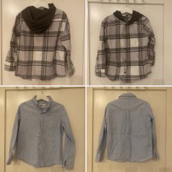 Två skjortor för barn. En svart skjorta med dödskallar och en röd-svart rutig skjorta med långa ärmar.