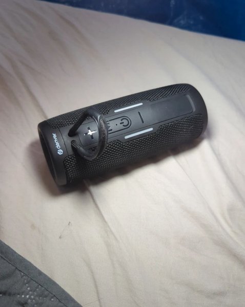 Bärbar Bluetooth-högtalare från Denver. Högtalaren är svart och har knappar för ström, volymkontroll och uppspelning/paus. Den har en rem för enkel transport.