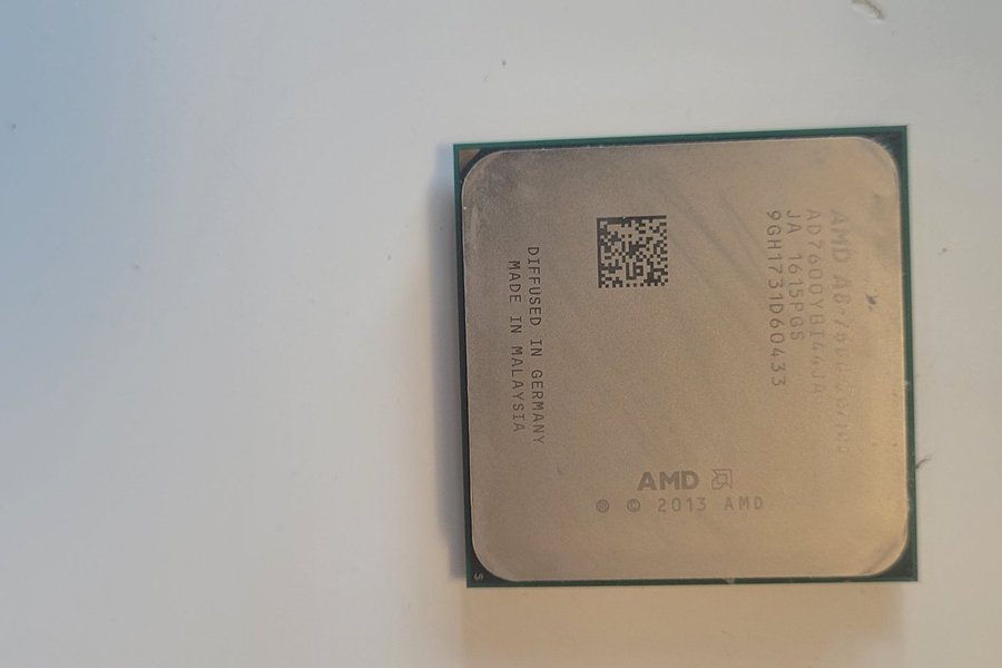AMD A8-7600 processor med modellnummer AD7600YBI44JA. Processorn är tillverkad 2013