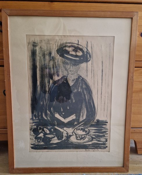 Föreställande en kvinna med hatt sittandes vid ett bord med en kopp och fat. Vet ej teknik, kanske onumrerad litografi. Storlek ca 40x50cm.