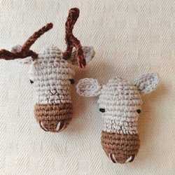 Två virkade kor i rödbrunt och mörkbrunt bomullsgarn.