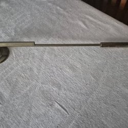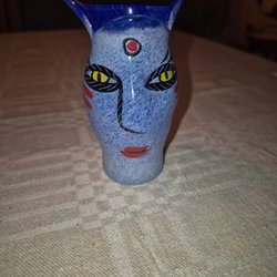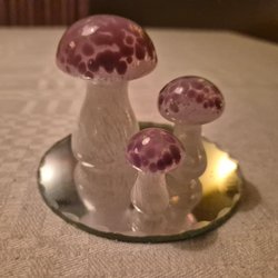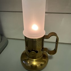 En dekorativ fotogenlampa med färgat glas och mässingsfärgad fot. Höjd 32 cm. Möjligen en skada i kupan(se foto) eller oregelbunden kant.