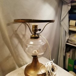 En bordslampa med fot i mässing och en tulpankupa i glas. Höjd med kupa 42 cm, Nr: 1.
