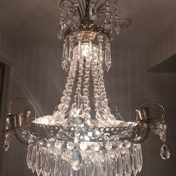 En vacker kristallkrona med guldförgyld stomme ,fina kristallprismor och en vacker blå skål.