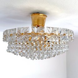 En vacker äldre kristallkrona med guldfärgad stomme och prismor. Perfekt för att addera en elegant touch till ditt hem.