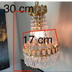 Kristallkrona med prismor. Lampan har en stomme i mässing och är dekorerad med hängande prismor. Den sprider ett vackert sken när den är tänd. Lampan har 6 lampor och är i mycket gott skick.