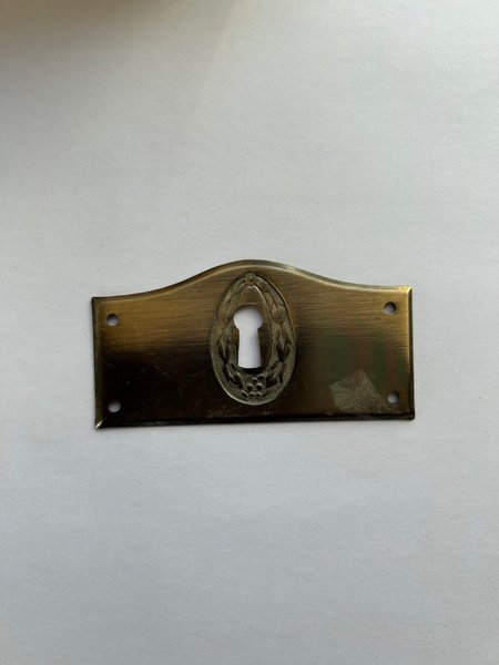 Låsskylt metall. Skiftar i färg, mörk nertill som blir mässing högre upp.