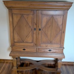 Ett skåp i trä med dörrar och lådor. Skåpet har hyllor inuti.