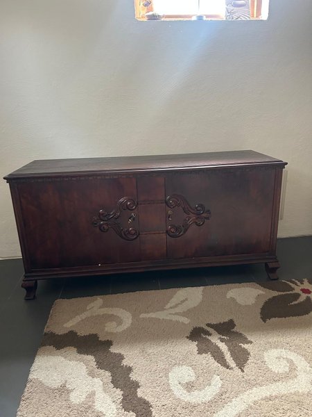 Skåp i trä med dekorativa detaljer. Skåpet har två dörrar med nyckelhål och står på fyra ben.