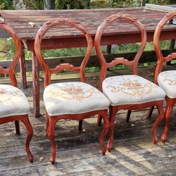 Dessa stolar är i fransk lantlig stil (”French Provincial” eller ”Country French”) med stege-ryggstöd (”ladder back”) och sitsar av flätat sjögräs (”rush seats”). De är tillverkade av massivt trä, troligen ek, och har en snidad blommedaljong i toppen av ryggstödet.