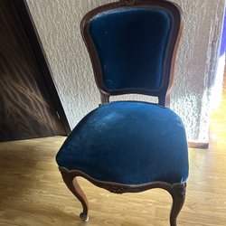 En vacker antik stol med träram och ett tygsäte med slitage. Lätt att ersätta för den händige. Perfekt för den som uppskattar klassisk design och vill lägga till en elegant touch i sitt hem.