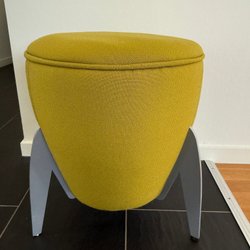 En pall med två steg i metall och blåa stegytor. Pallen har en enkel design och är lämplig för användning i hemmet. Säljes i befintligt skick.