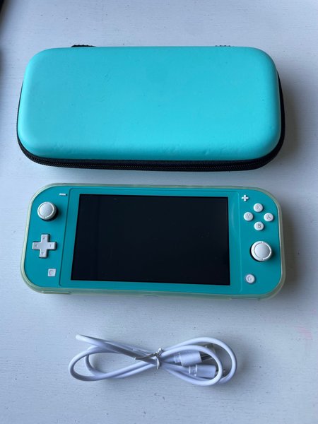 Nintendo Switch Lite i turkos färg. Inkluderar ett fodral, gummi protektor en laddningskabel.