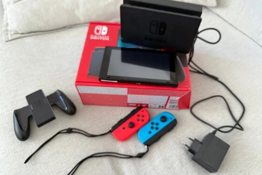Nintendo Switch med Joy-Cons (en röd och en blå), Joy-Con-grepp, dockningsstation och strömadapter.