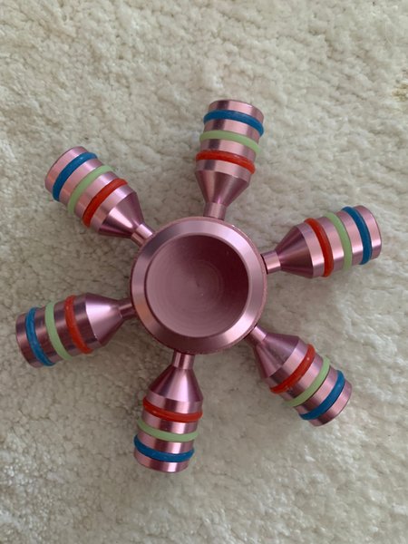 Fidget spinner i metall med sex armar. Varje arm har tre färgade ringar i blått, grönt och rött. De 6 ändarna går att skruva loss och konfigurera i olika positioner efter egen smak. Dimensioner: 60x60x12 mm. Säljs utan förpackning.