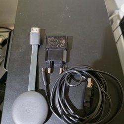 Säljer en Google Chromecast med tillbehör. Inkluderar fjärrkontroll och strömadapter.