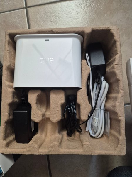 Arlo SmartHub för Arlo-system. Enheten är vit och kommer med strömadapter och nätverkskabel.