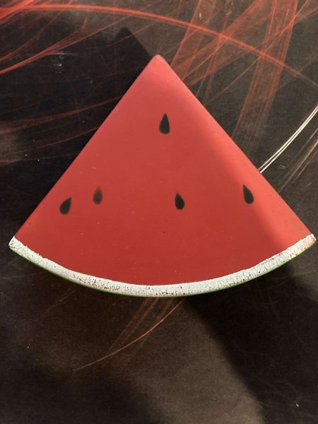 En trekantig skiva formad som en vattenmelon. Den är röd med svarta prickar som föreställer kärnor. Kanten är vit och grön, vilket liknar vattenmelonens skal.
