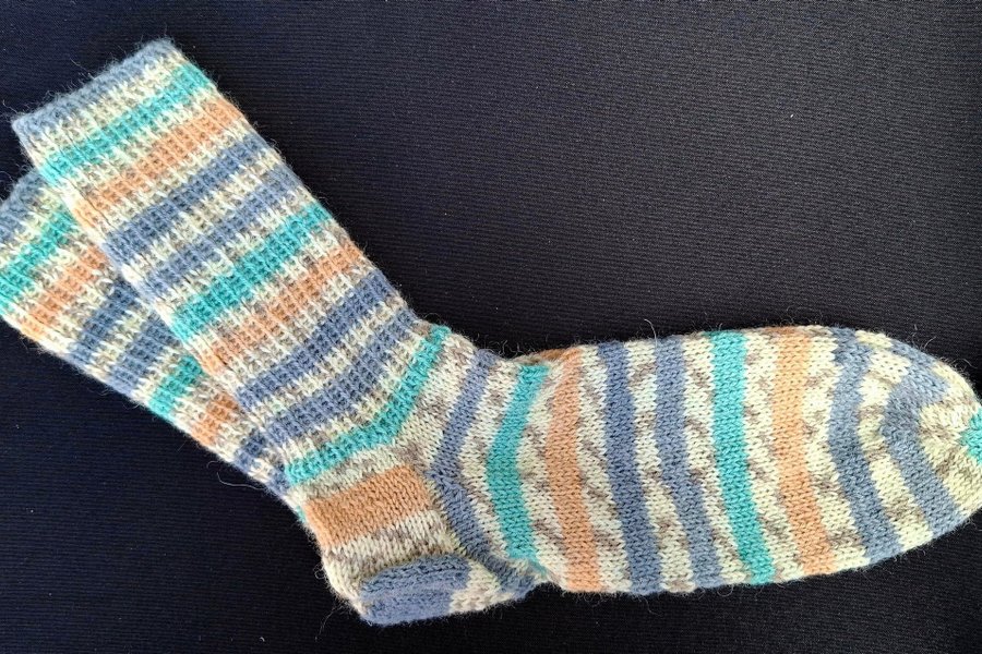 Ett par handstickade raggsockor i tunt garn, olika färger. Strumporna har ett randigt mönster i blått, grönt, beige och vitt.