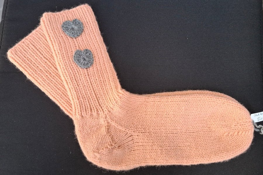 Ett par stickade raggsockor i en ljusaprikos färg. Strumporna har två gråa hjärtan fastsydda på sidan.
