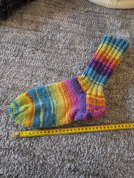 Ett par handstickade regnbågsfärgade sockor. Sockorna har en livlig färgpalett med ränder i olika nyanser som gult, orange, rosa, lila, blått och grönt. De är stickade med ett klassiskt mönster och har en ribbad mudd upptill för en bekväm passform. En måttband ligger bredvid sockan, vilket indikerar att sockan är cirka 26 cm lång från häl till tå.