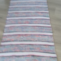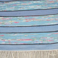 En blå trasmatta med vita ränder. Mattan har fransar.