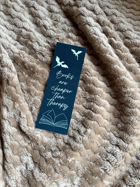 Egendesignat bokmärke printat på stabilt, glansigt papper. ”Books are cheaper than therapy” med drakmotiv. 17x6cm