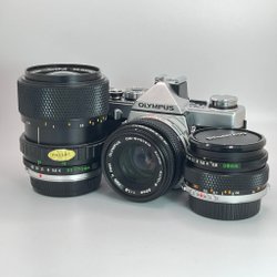 Olympus OM-1 35-mm-Filmkamera mit Zuiko 50 mm f/1,8 & 28 mm f/2,8 und 35–70 mm f/4