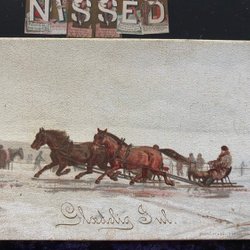 Kartonkarte Pferde ziehen einen Schlitten, signiert Karba?