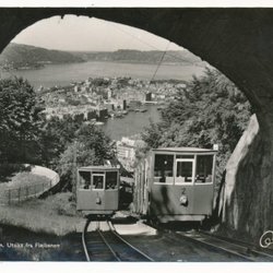Blick auf Bergen vom Flöjfjället 2 Waggons auf der Flöjbanan Oppi 503 Dat -57 alt -67*