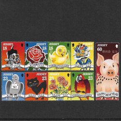 Jersey Glückwunschbriefmarken Hund Katze Schwein Vögel Mi 678-86 xx