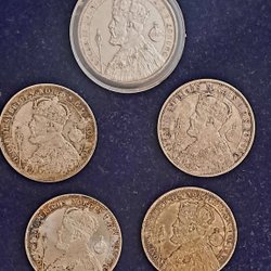 Fünf 2-Kronen-Silbermünzen von 1878 bis 1907 mit dem Porträt von Oscar II.