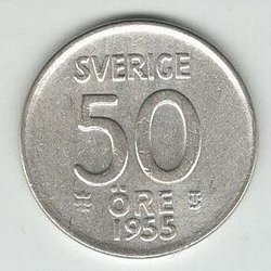 1. Gustaf Vl Adolf, Silbermünze, Wert 50 Öre. Jahr 1955.