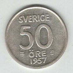 1. Gustaf Vl Adolf, Silbermünze, Wert 50 Öre. Jahr 1957.