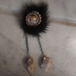Brosche 60/70er Handwerk Braun Flauschiger Mink mit 2 Grauen Anhängern Länge 17 cm