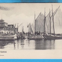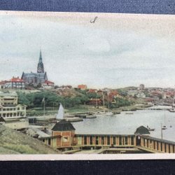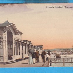 LEICHTER KEIL. Das Seebad "Trompen" mit Menschen und einem kleinen Dampfschiff, schöne Farbgebung um 1915