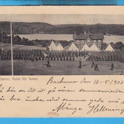 BACKAMO. Gruß an die Fahne, Übersicht mit vielen Soldaten 1903 (Uddevalla)