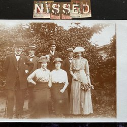 Echte Fotopostkarten 4 Herren und 3 Damen mit schönen Hüten gestempelt Gäfle