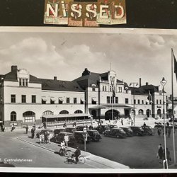 GÄVLE-Hauptbahnhof von der Straßenseite mit schönen Autos aus den 1940er Jahren. Die Pressestelle