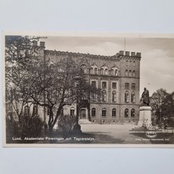 Postkarte Lund. Akademiska Föreningen und Tegnérstatyn, 1938