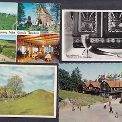 - Gammaldags vykort som avbildar Gamla Uppsala, där historiska gravhögar reser sig stolt.