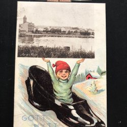 Kleine semitopografische Postkarte Junge in Schuhen Arvika