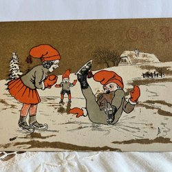 Wichtel machen Weihnachtsbrei. Schöne Weihnachtskarte mit Vers sign SA SIGNE ASPELIN 1909