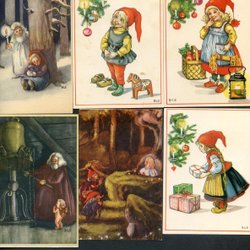 6 kleinformatige Weihnachts-/Neujahrskarten, signiert B-LE (Britt-Lis Erlandsson), 1940er-70er Jahre