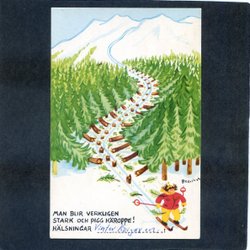 Hier oben wird man richtig stark und energiegeladen! Ski-Humorkarte signiert BERTIL A aus den 1960er Jahren