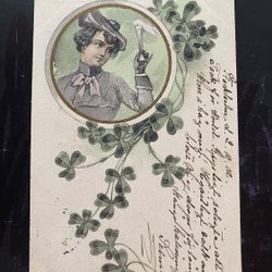 Schöne Karte im Jugendstil Mädchen mit vierblättrigem Kleeblatt