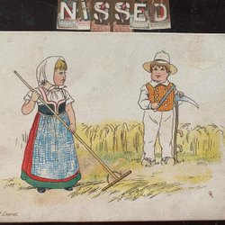 Karton Junge und Mädchen mit Rechen und Sense Norweger