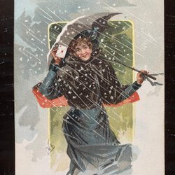 Kartonkarte Dame mit Regenschirm im Regen dänisch signiert WM