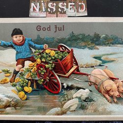 Schwein zieht Engel in Gold und Relief