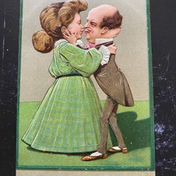Lustiger Witz kardiert Mann und Frau, die Erleichterung küssen
